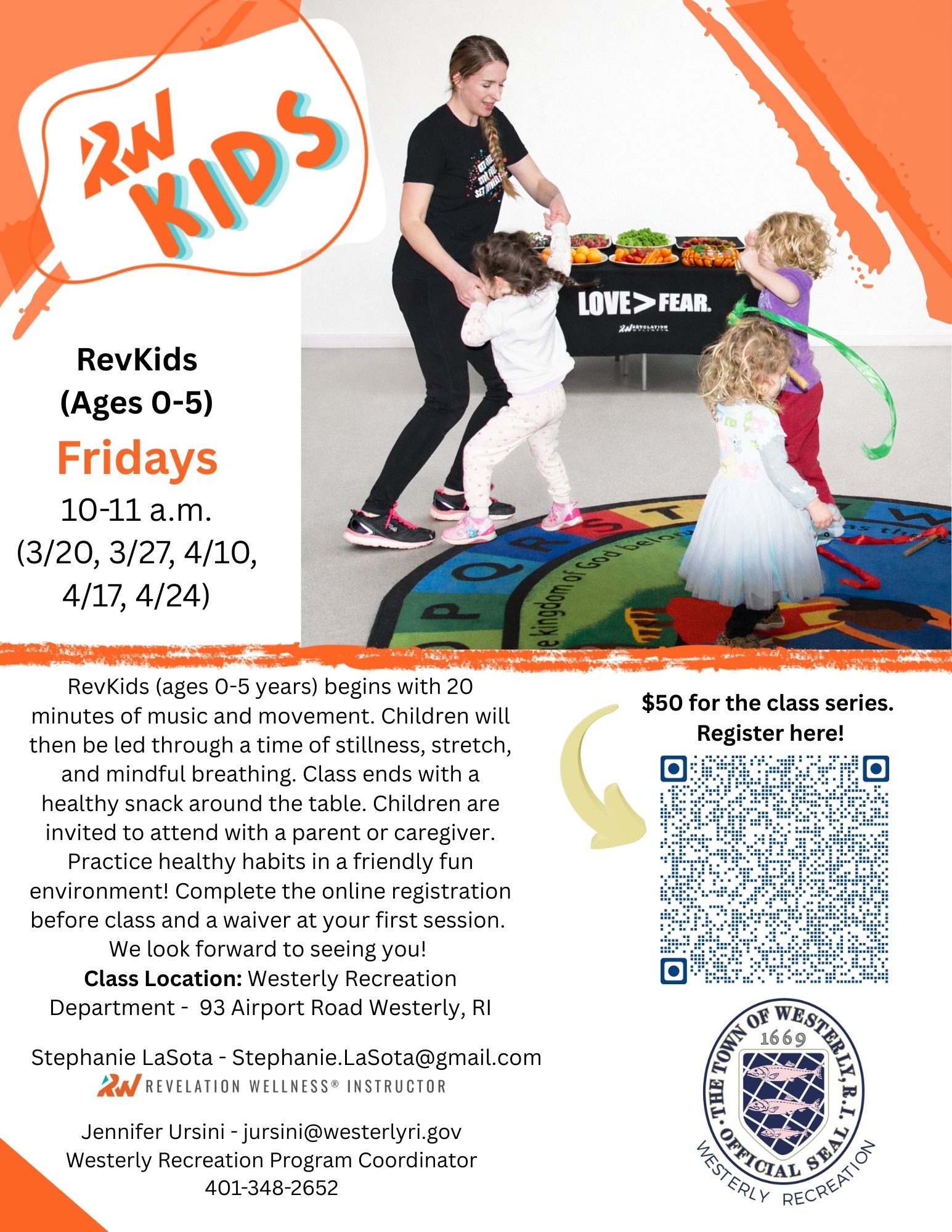 RevKids (ages 0-5 years) begins with 20 minutes of music and movement. Children will then be led through a time of stillness, stretch, and mindful breathing. Class ends with a healthy snack around the table. Children are invited to attend with a parent or caregiver. Practice healthy habits in a friendly fun environment! Complete the online registration before class and a waiver at your first session. We look forward to seeing you!