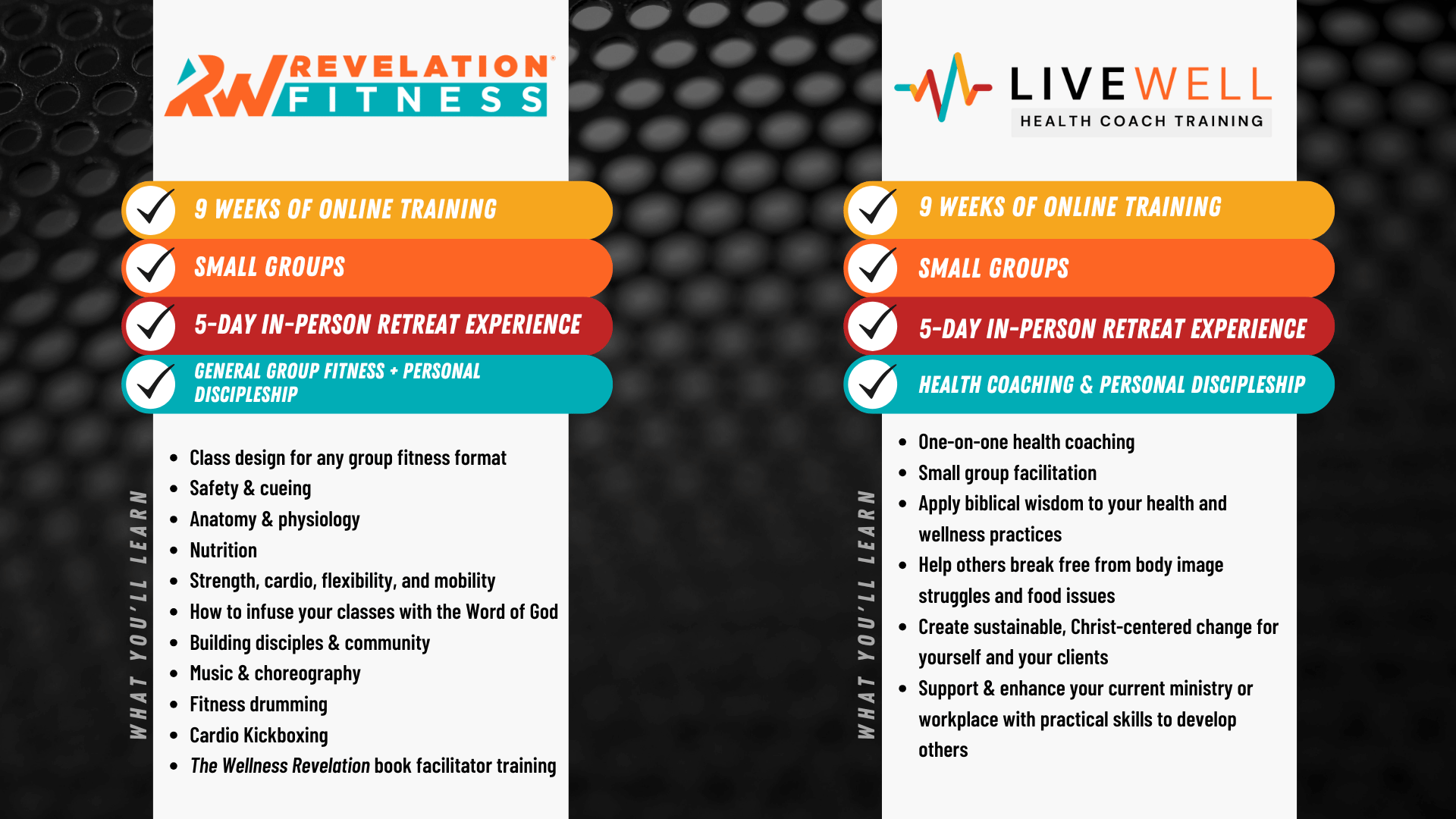 Lead others to health & wholeness as a Revelation Fitness Instructor or LiveWell Health Coach.